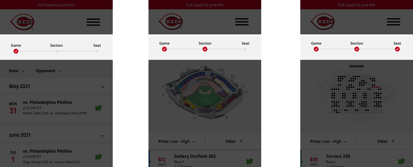 The goal was to recreate a mobile set of flows for booking a ticket online to a home Cincinnati Reds game.